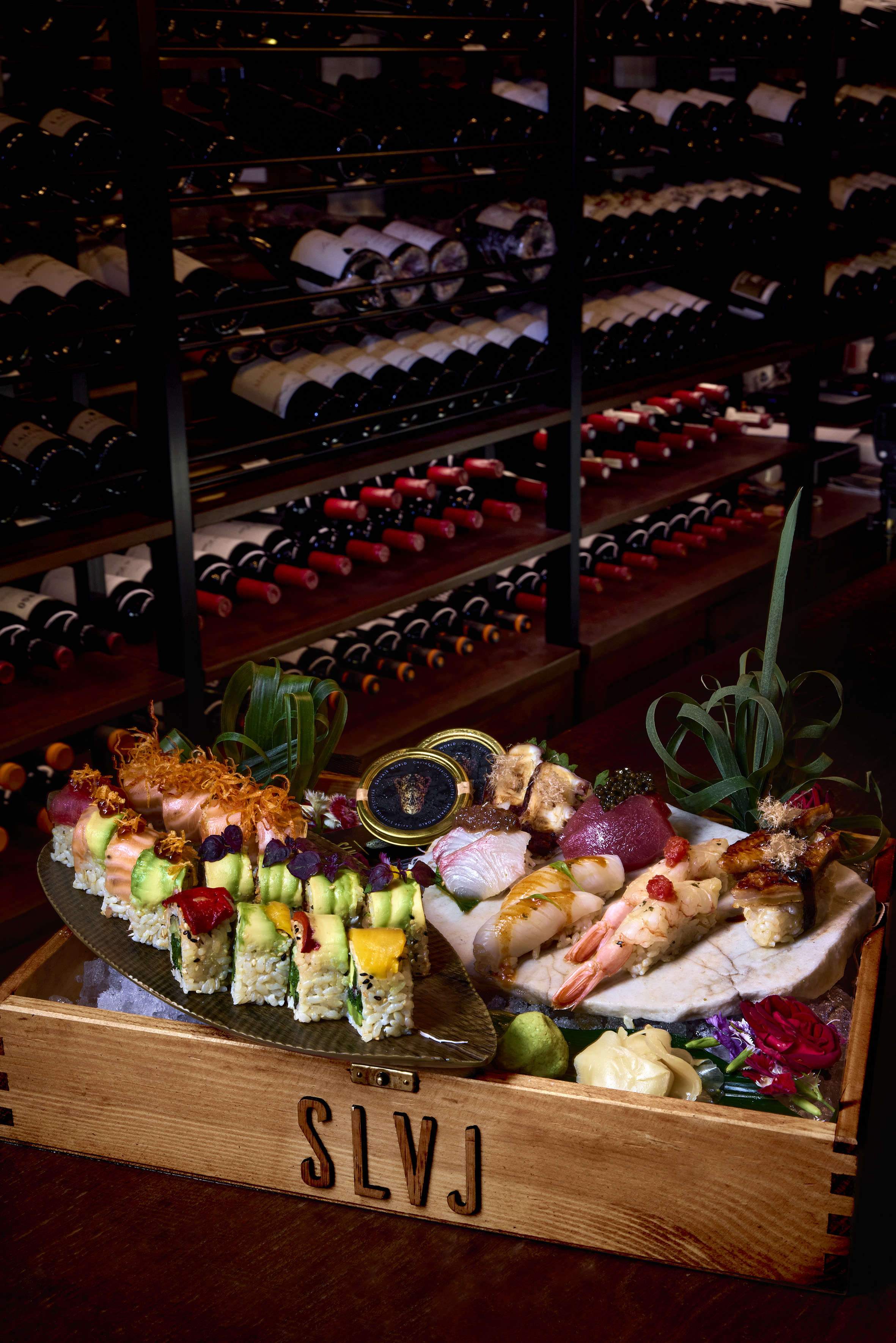 Selección de Rolls que incluye 4 tipos: Vegan Roll, Spicy Salmon, Spicy Tuna Roll y Shrimp Roll (4 piezas cada uno), surtido de Sashimis de Pulpo, Hotate y Salmon (2 piezas cada tipo) y set de Nigiris con Cigala, Ika y Unagi (2 piezas de cada tipo).